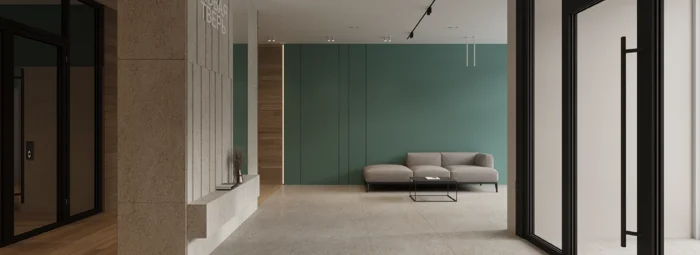 В каждом подъезде предусмотрен просторный и красивый холл, выполненный по индивидуальному дизайн-проекту. Вход в подъезд без ступеней облегчит доступ мамам с колясками и маломобильным группам.